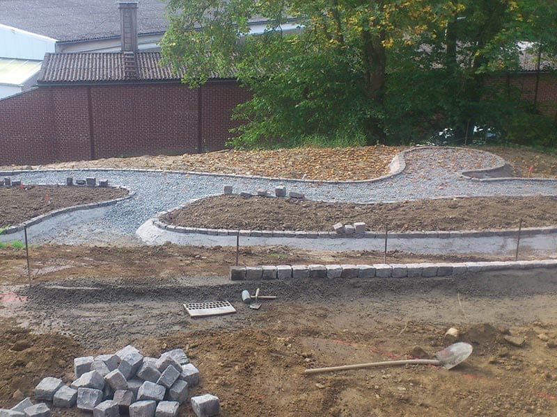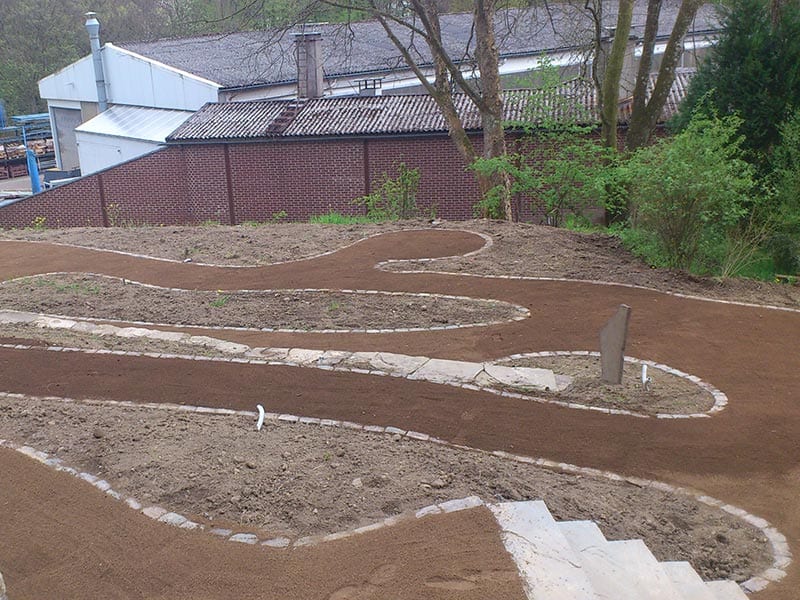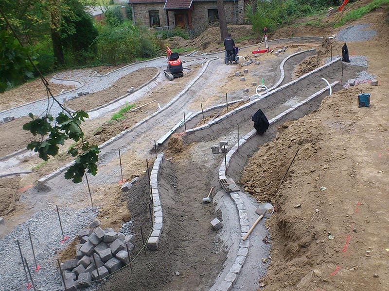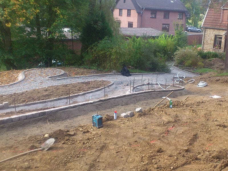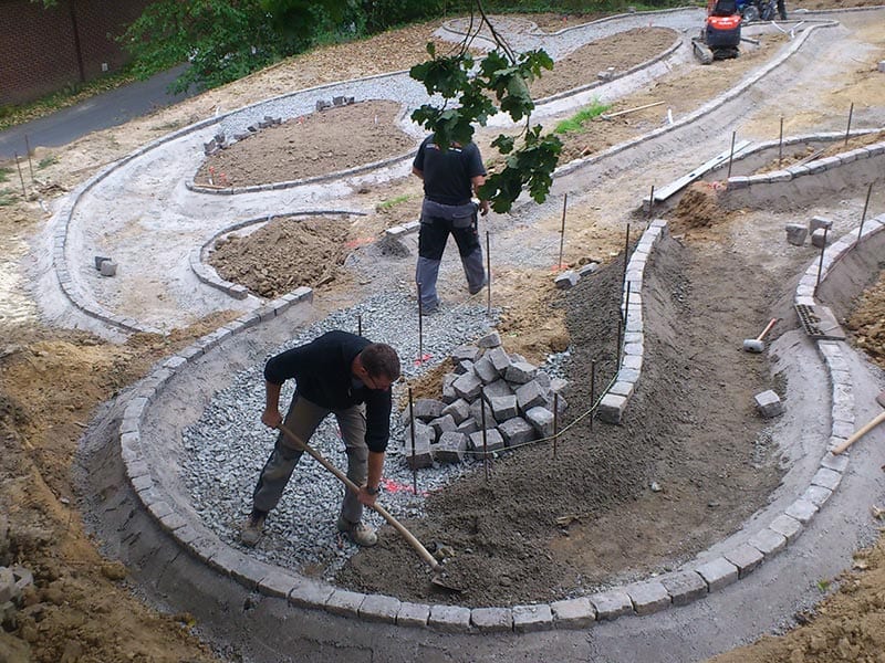 Vom ersten Spatenstich bis zur fertigen Wegeführung: Erdarbeiten, Randsteinverlegung und die Anlage geschwungener Wege und Beetflächen bilden die Grundlage für eine durchdachte Gartengestaltung. Wir realisieren auch großflächige Außenanlagen – wie Teile der Parkanlage des Buddhistischen Zentrums Waldbröl – mit Präzision und dem nötigen Feingefühl für natürliche Geländeformen und organische Wegeführung.
