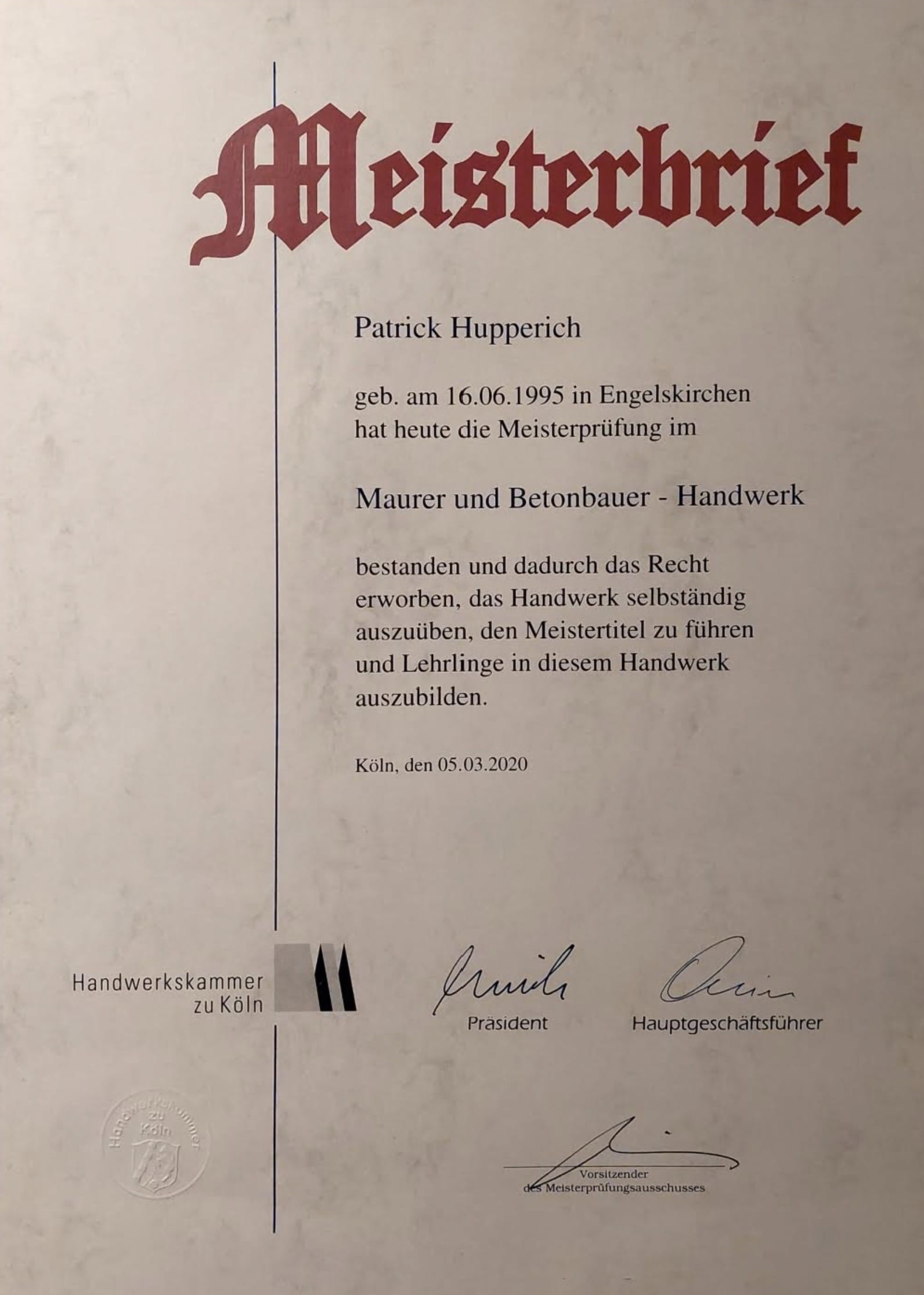 Unser Unternehmen wurde im Mai 2000 gegründet. Geschäftsführer ist Werner Hupperich, der zum Zeitpunkt der Gründung bereits mehr als 25 Jahre Berufserfahrung bei anderen Baufirmen gesammelt hatte und die notwendigen Qualifikationen (Handwerksmeister) mitbringt.